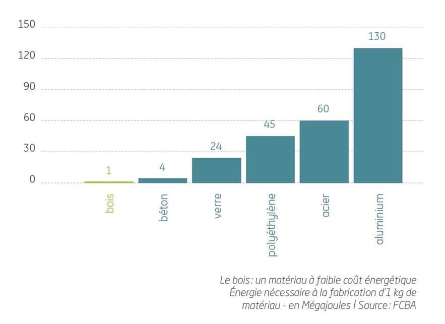 Pour sa transformation, le bois exige peu d’énergie. De tous les matériaux de structure, le bois est celui dont le contenu en énergie grise est le plus faible : il est par exemple plus de 100 fois inférieur à celui de l’aluminium.
