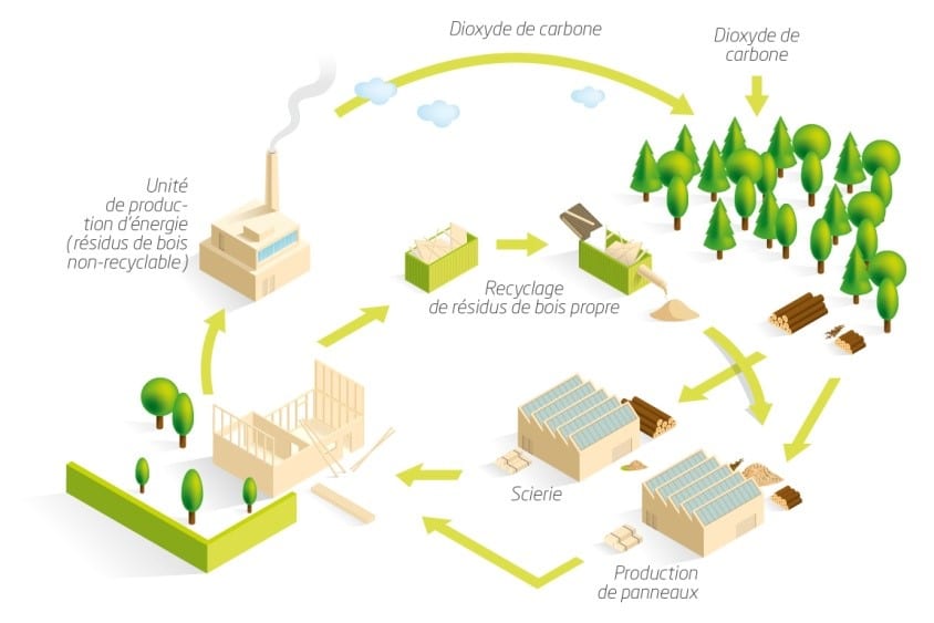 - en fin de vie, les produits bois sont recyclés ou brulés dans des chaufferies bois énergie, qui permettent de se substituer aux énergies fossiles et qui sont neutres en terme de gaz à effet de serre.