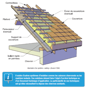 Pour cela, le système ≪ sarking ≫ est un procédé d’isolation thermique des toitures inclinées caractérisé par la pose de panneaux isolants rigides au-dessus des chevrons ou des fermettes. ce système doit faire l’objet d’un Avis technique ou d’un Document technique d’application.